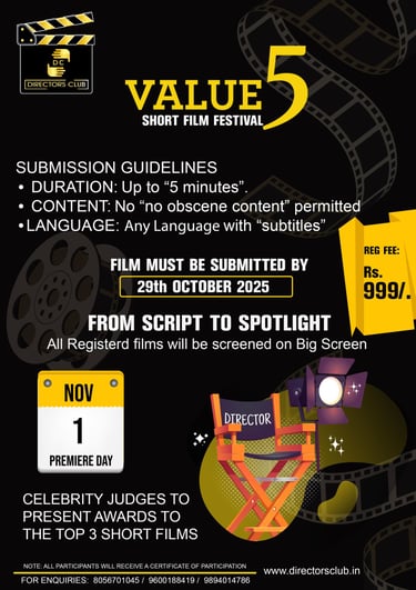 Welcome to Value5 Short Film Festival 2025, organized by Directors Club, Chennai, a vibrant platform that celebrates the art of storytelling, creativity, and filmmaking. This yearβs theme, βValue5β, stands for the five timeless values that shape humanity β Compassion, Integrity, Perseverance, Teamwork, and Respect. Filmmakers, students, and creative minds from across India are invited to submit their short films (up to 5 minutes) and bring their vision to life on the big screen!